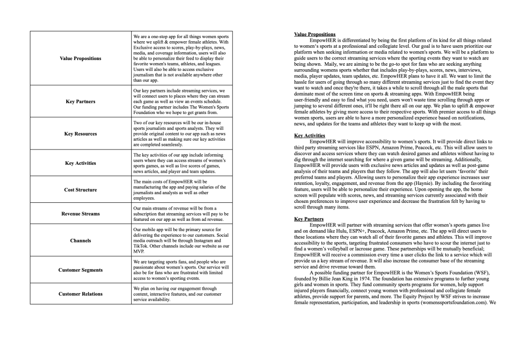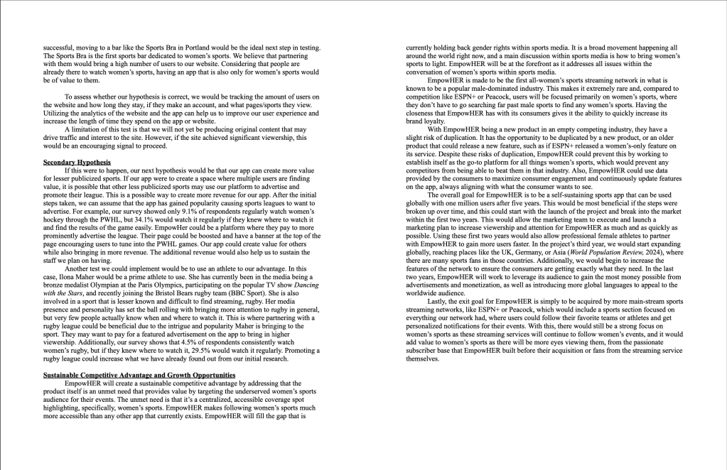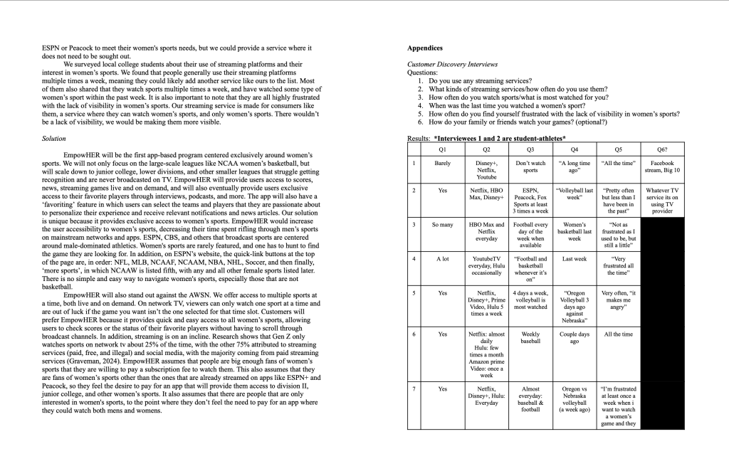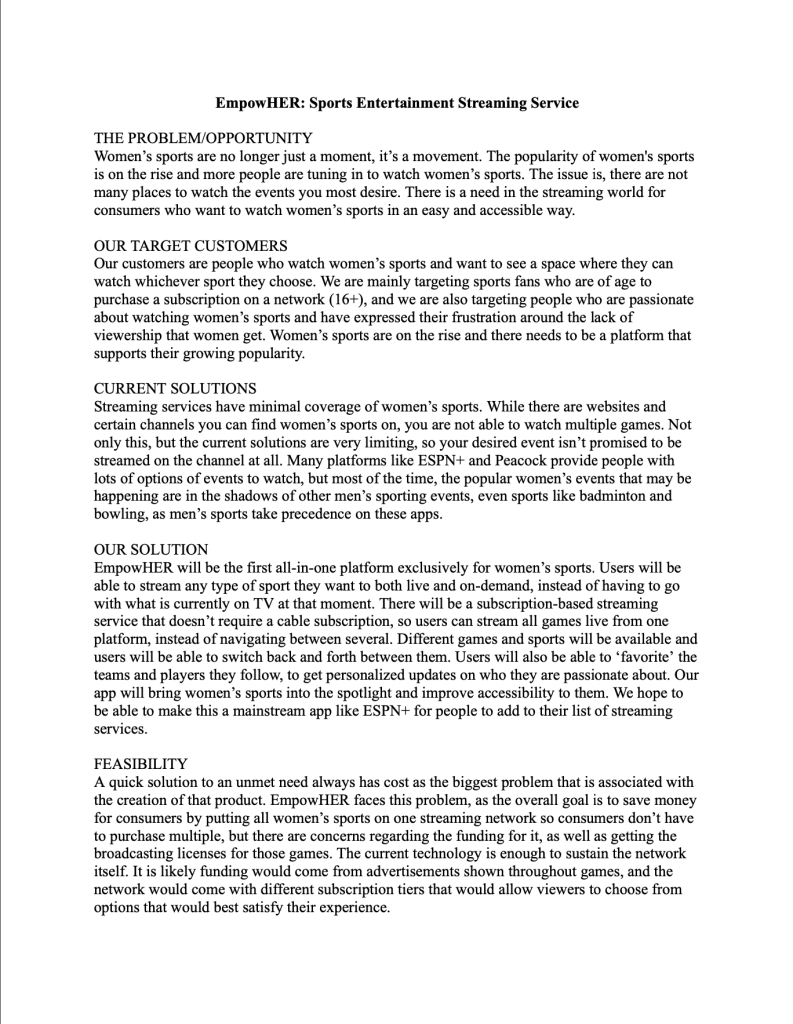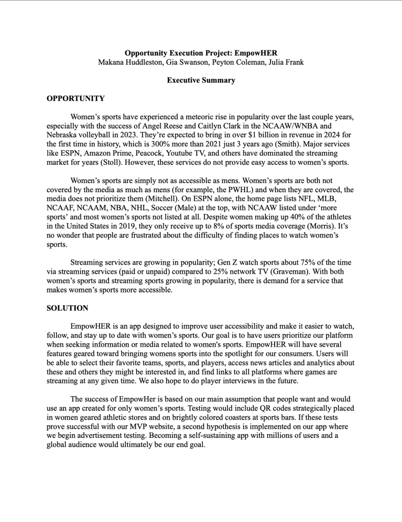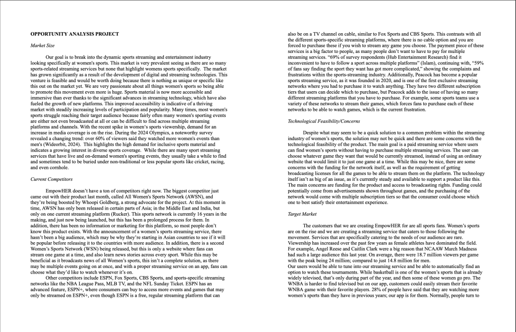 Throughout the term, my group and I worked on creating a hypothetical company. We figured out who are competitors would be, how we would build the platform, and how we could make it successful. Here, you will be able to read the report we put together along with our slide deck presentation. There will be the OAP and OEP presentations. You can see how we took feedback from our peers and professor in order to make improvements to our vision. This class was part of my entrepreneurship minor.