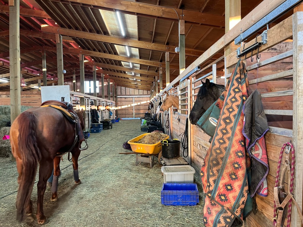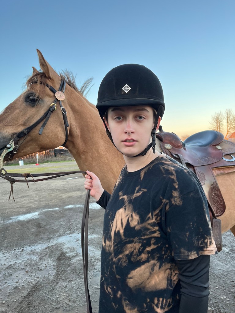 The Oregon Horse Center is home to the Equestrian team’s horses. Clare Cushman (20) attends their riding lesson here every Tuesday evening. They prepare the horse for riding by brushing, saddling and picking the dirt out of the horse’s hooves.