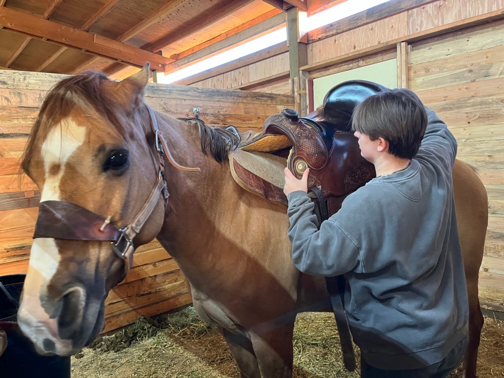 The saddle is hoisted onto the horse by Cushman. The saddle is heavy and requires strength to get it onto the horse. They then have to adjust the saddle to sit correctly on top of the horse and fasten it under the belly.