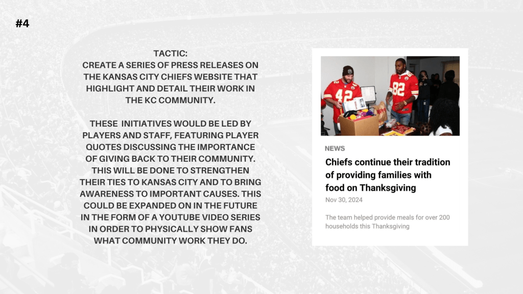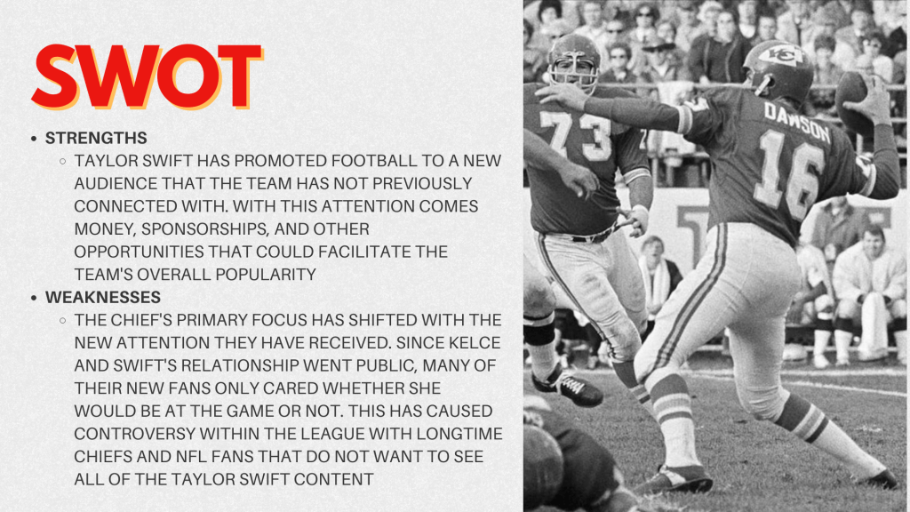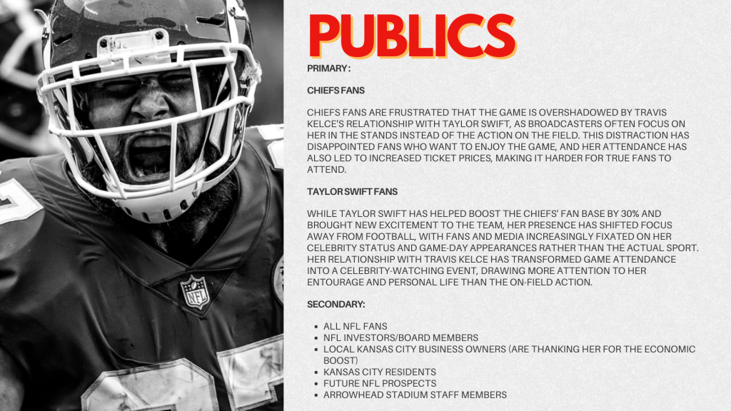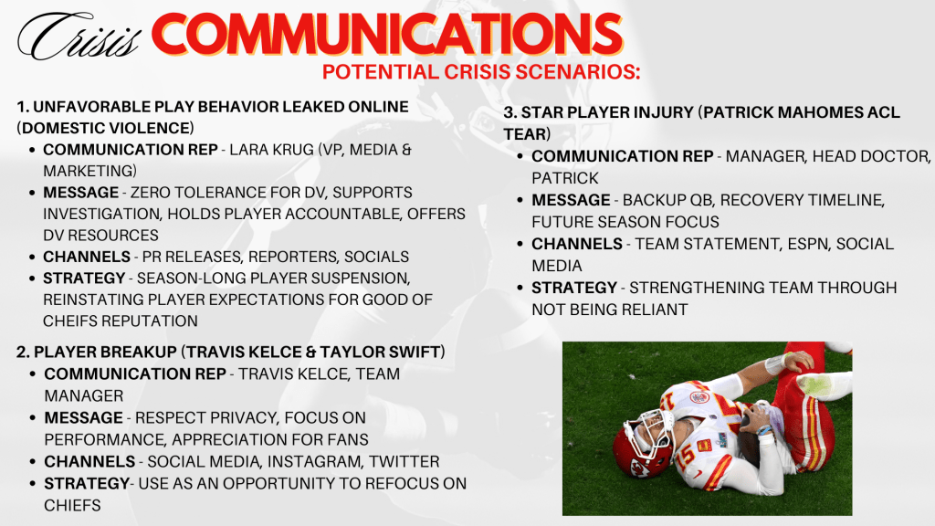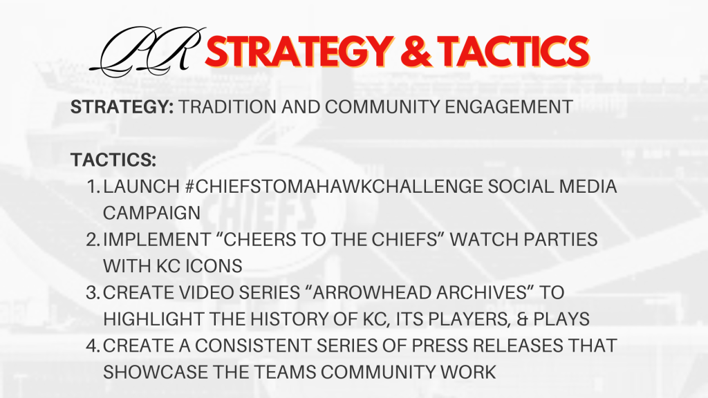 Taking Sports Public Relations provided me the chance to do an in-depth look into a sports organization or athlete. My group decided to focus on the Kansas City Chiefs. Our goal was to create a plan that brought the focus back onto football and the history and culture of the Chiefs, instead of the famous relationships that seem to overpower that. I also did a couple brief case studies and an organizational communications audit.